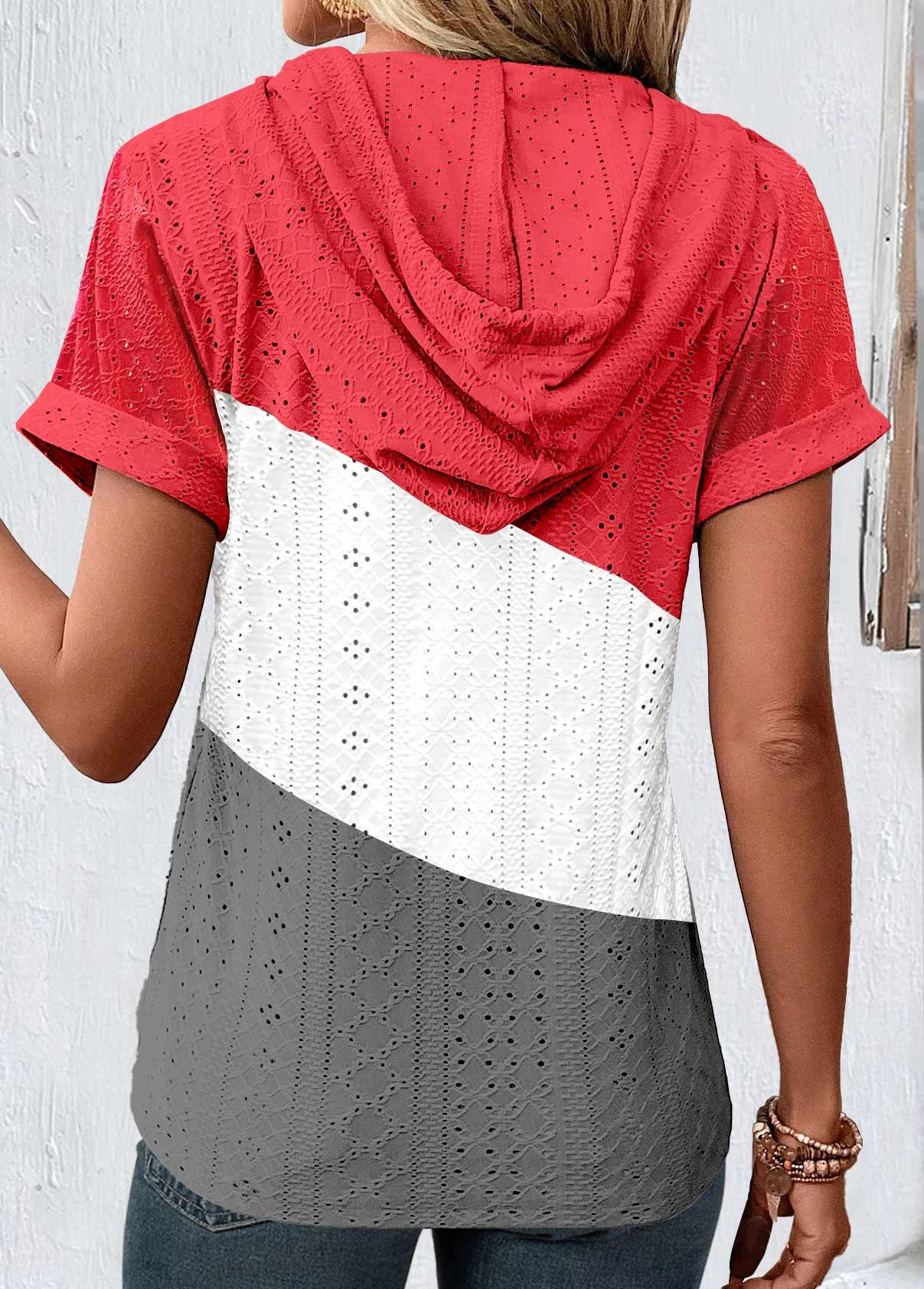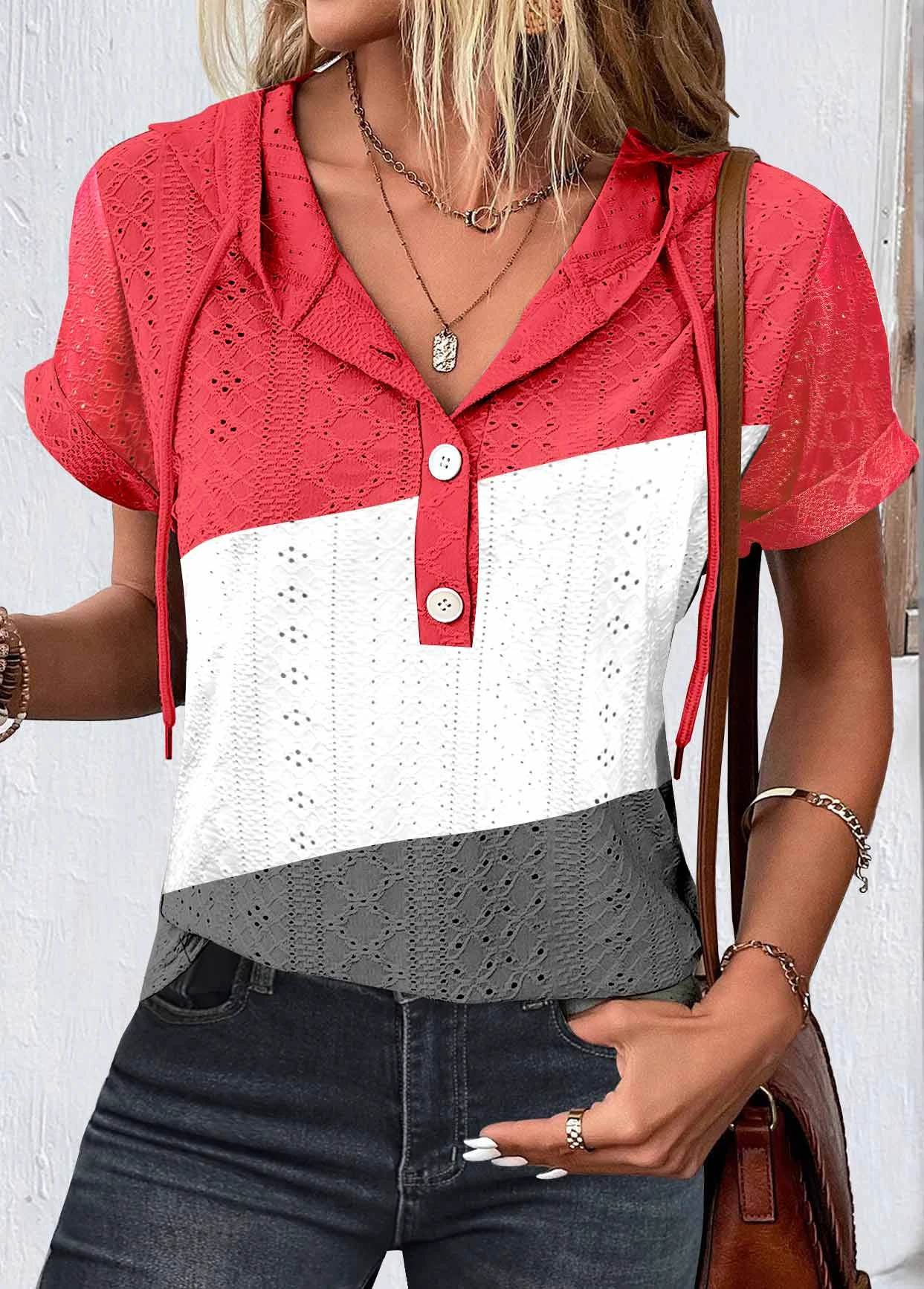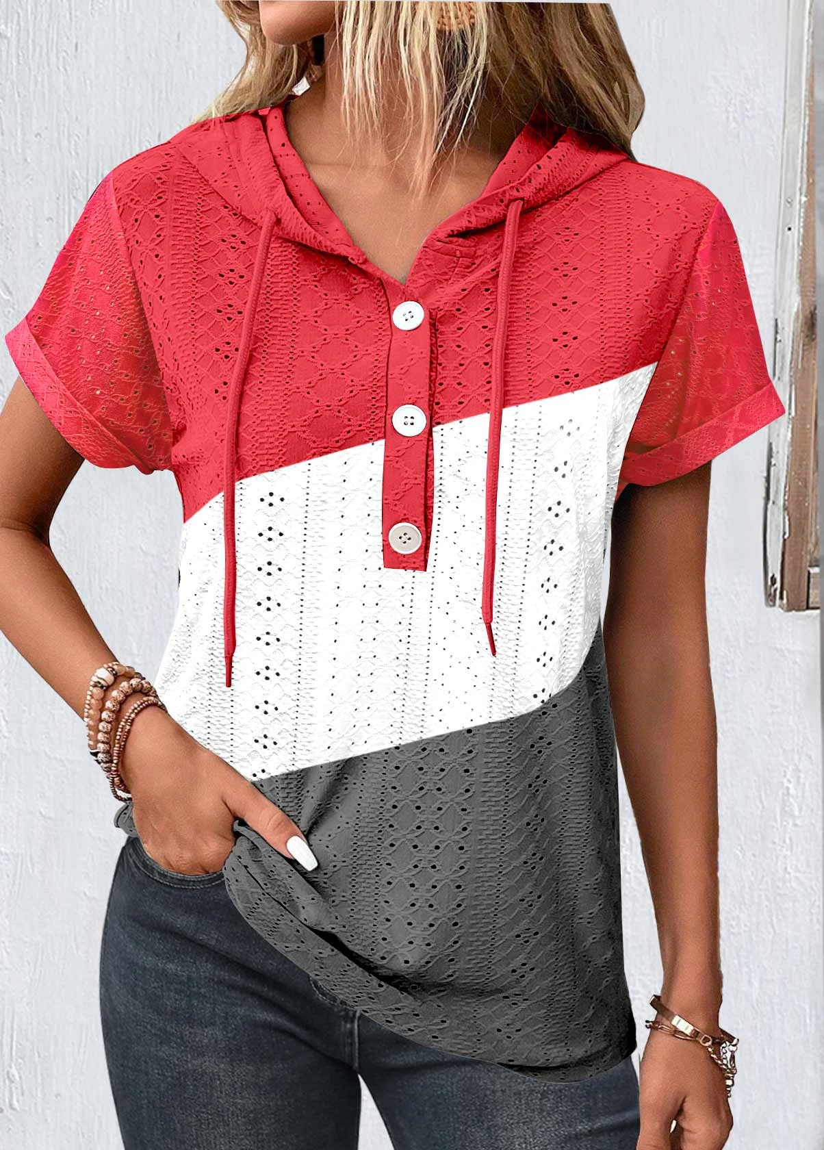 Button Hooded Short Sleeve Multi Color T Shirt