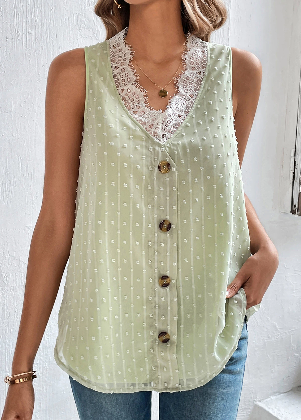Light Green Patchwork V Neck Lace Tank Top