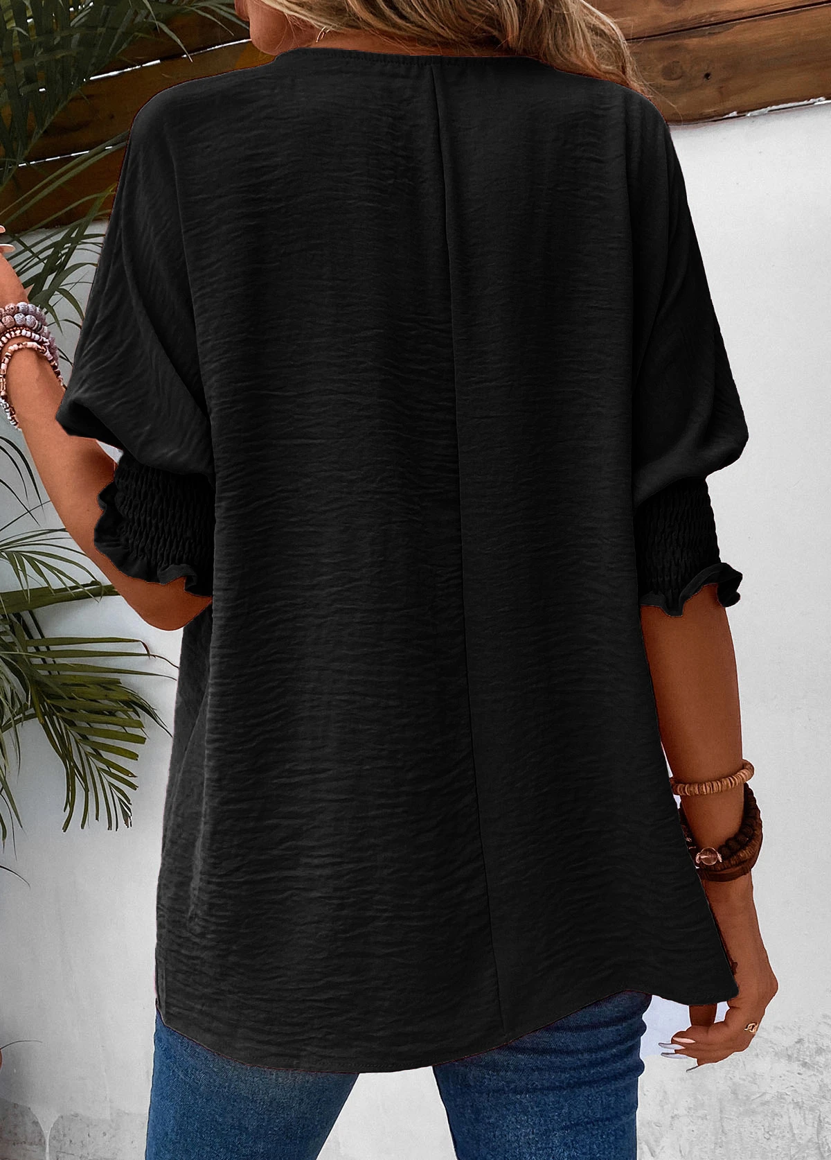 Smocked Round Neck Half Sleeve Black T Shirt