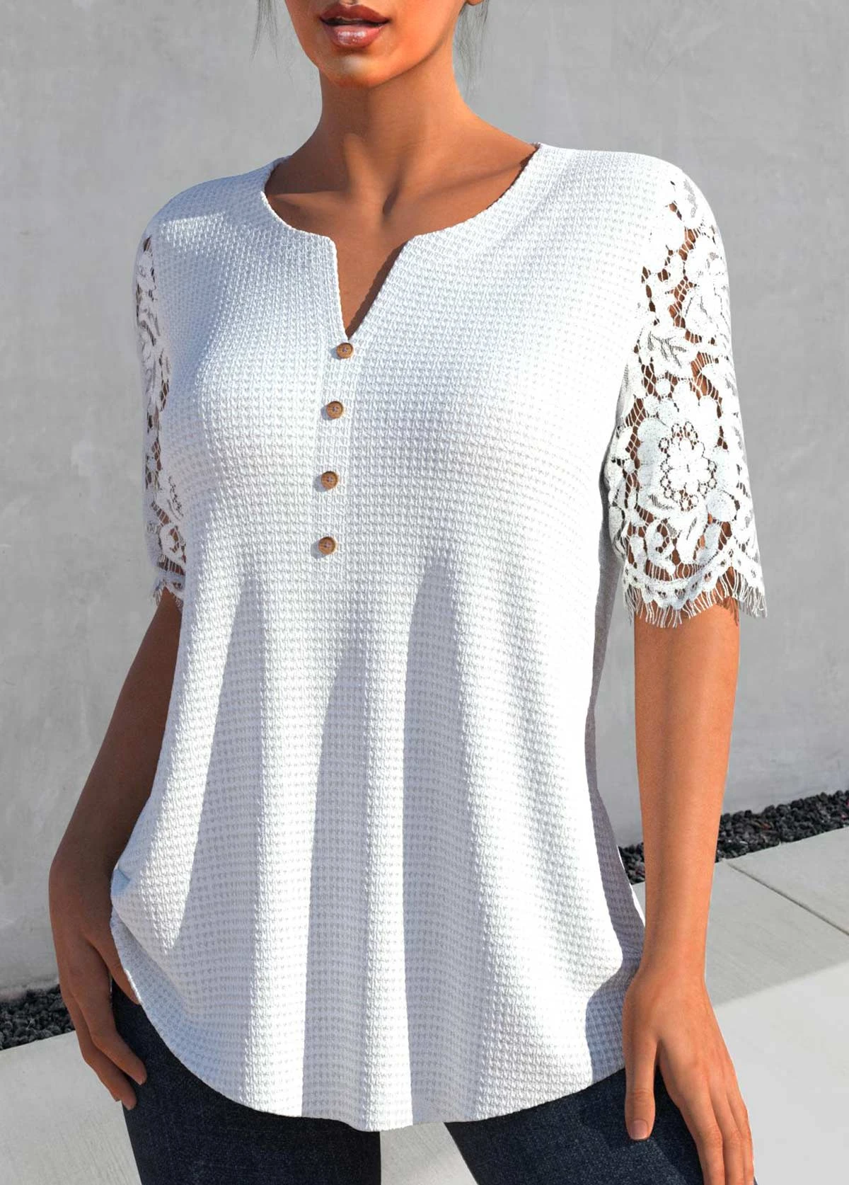Tuck Stitch Split Neck Half Sleeve White Blouse